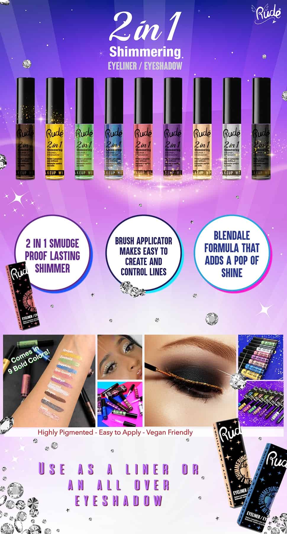 Ajlajnerom i senkom za oči 2 u 1 stvorite uticajan make up look sa aplikatorom za senku u vidu četkice za šminkanje. Savršeno precizna linija ajlajnera je dostupna u samo dva poteza. Fine šljokice daju pun sjaj Vašem izgledu. Proizvod je dostupan u 9 boja – zlatno-žuta, zelena, plava, roze, ljubičasta, siva, braon, crna i bež. Ove nijanse senki daju ujedno i svetao i reflektujući sjaj. Boja se nanosi glatko i ravnomerno.