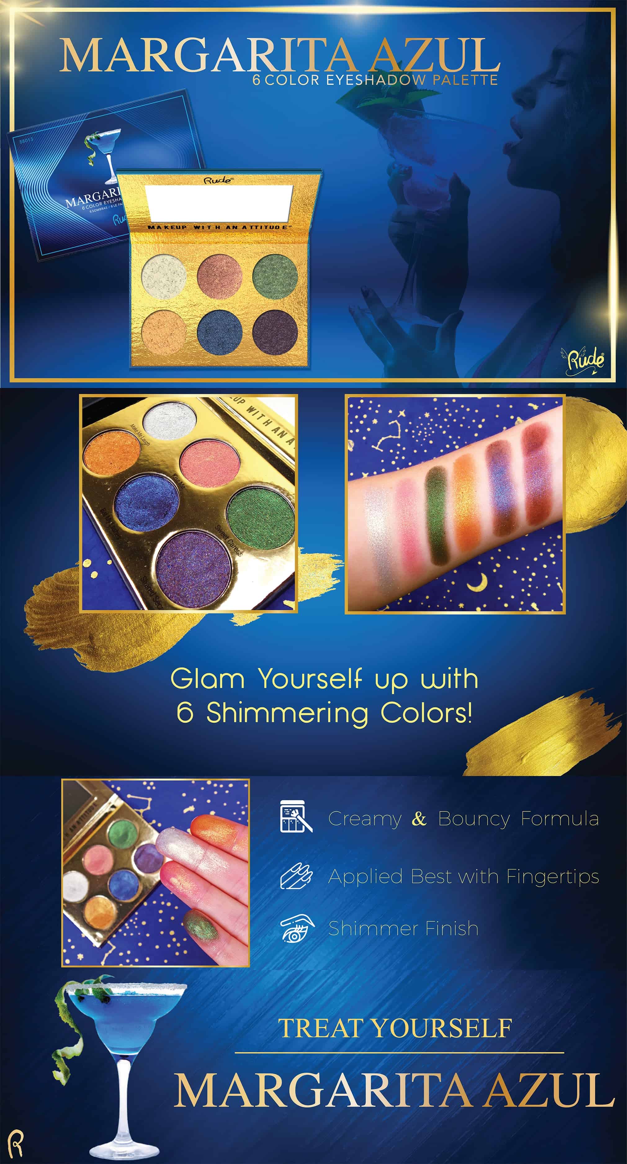 Paleta senki za oči Margarita Azul je iz linije Coctail Party proizvoda. Paleta je jedinstvena kolekcija od 6 sjajnih šljokičastih senki. Elegantan make up za uzbudljivu avanturu. Savršeno šminkanje zahvaljujući kremastoj formuli senke. Diskretan sjaj ili blistavi glamur, izbor je na Vama! Najbolje se primenjuje sa prstima!